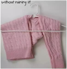 也可以在晾曬時(shí)用兩個(gè)衣架懸掛,以防止因懸掛過(guò)重而變形。毛衣晾干后還想繼續(xù)掛著,防止變形可以用這樣的掛式。洗完的衣服對(duì)折一下,衣架放置在袖子腋下的位置。袖子部位從衣架穿過(guò)后,再把毛衣下半段穿過(guò)晾曬。這樣掛起來(lái)毛衣不怕肩袖變形,也不容易有折痕。